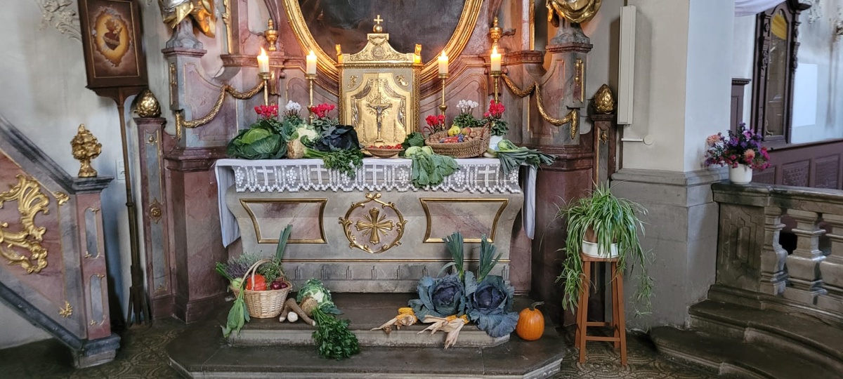 Den Erntedank-Gottesdienst feierte die Gemeinde mit einem Pater der Clateretiner aus Würzburg. Gedanken der Dankbarkeit für alles im Leben und für einen guten Glauben war sein Thema. Das gemeinsame Essen von Brot und trinken von Wein rundete den Gottesdienst ab und festigte die Glaubensgemeinschaft. Zudem wurden Erntegaben von der Untereisenheimer Weinprinzessin zum Altar gebracht.