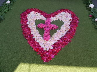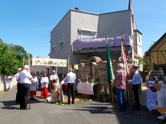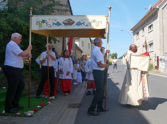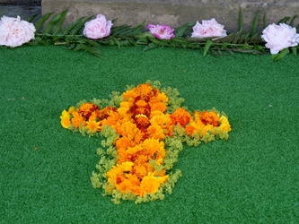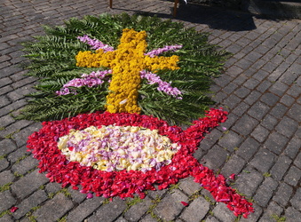 Bei den Prozessionsaltären als Stopp für besondere Gebete, Bitten und Lieder waren jeweils Blumenteppiche mit religiösen Motiven gelegt. In der katholischen Kirche sind kunstvolle Blumenteppiche aus tausenden Blütenblättern eine jahrhundertealte Tradition. Sie heben die Festlichkeit des Tages hervor und sind Ausdruck von Gemeinschaft, Kreativität und Glaubensfreude.