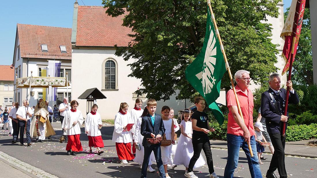Dankeschön sagte er der Musikkapelle Hausen unter der Leitung von Roland Wendel, den zahlreichen tüchtigen Ministrantinnen und Ministranten, der für die Sicherheit zuständigen Feuerwehr, den Fahnenabordnungen der Vereine, den Kommunionkindern und weiteren Kindern für das Blumenstreuen, dem Küsterteam, den vier Himmelträgern, allen Mitfeiernden und den Menschen, die ihre Häuser entlang des Weges geschmückt hatten.