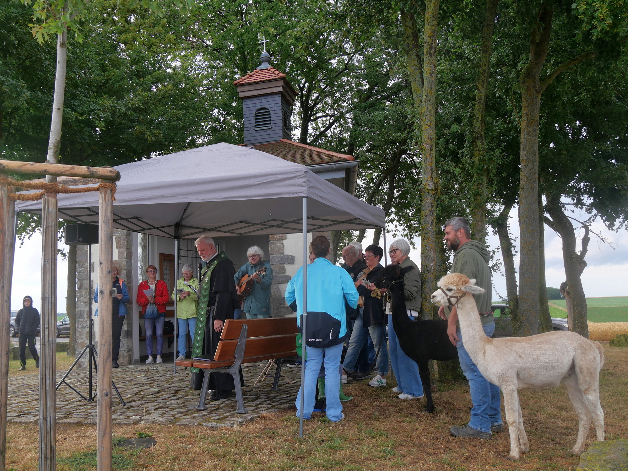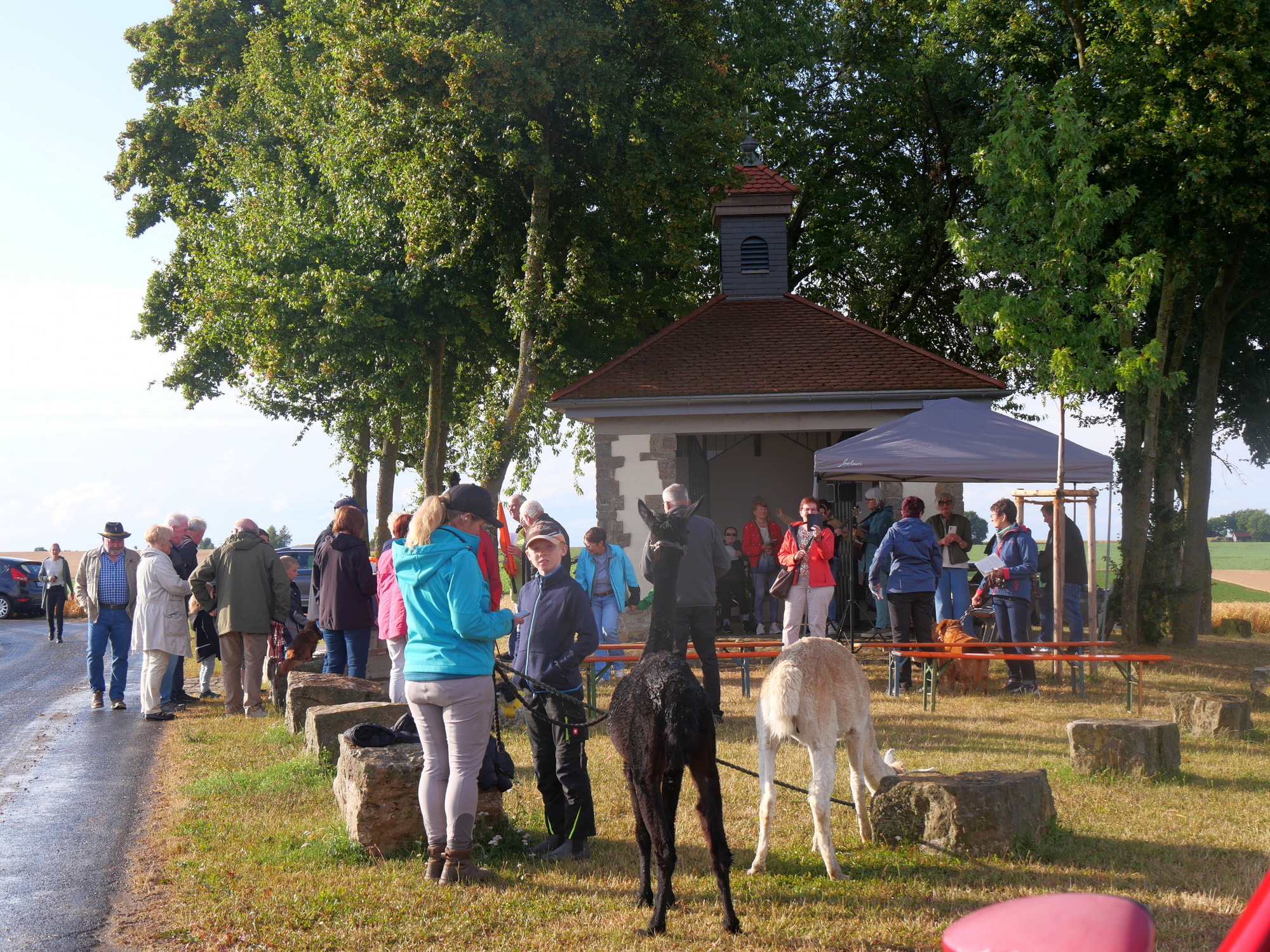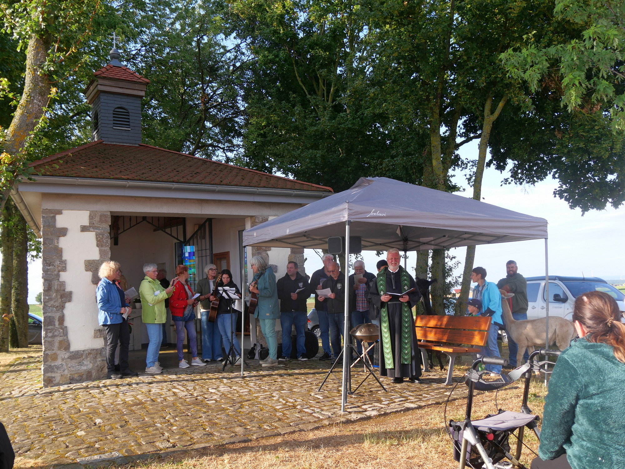 Zu einem besonderen Anlass versammelten sich Menschen und Tiere an der Hubertuskapelle bei Erbshausen-Sulzwiesen. Augustinerpater Matthäus Klein hatte zur Tiersegnung und damit zu einem Lobpreis Gottes mit all seinen Geschöpfen eingeladen. Die nahe Wallfahrtskirche Fährbrück lag im warmen Abendlicht, als der Gottesdienst beim Läuten der Glocke am Seilzug begann.