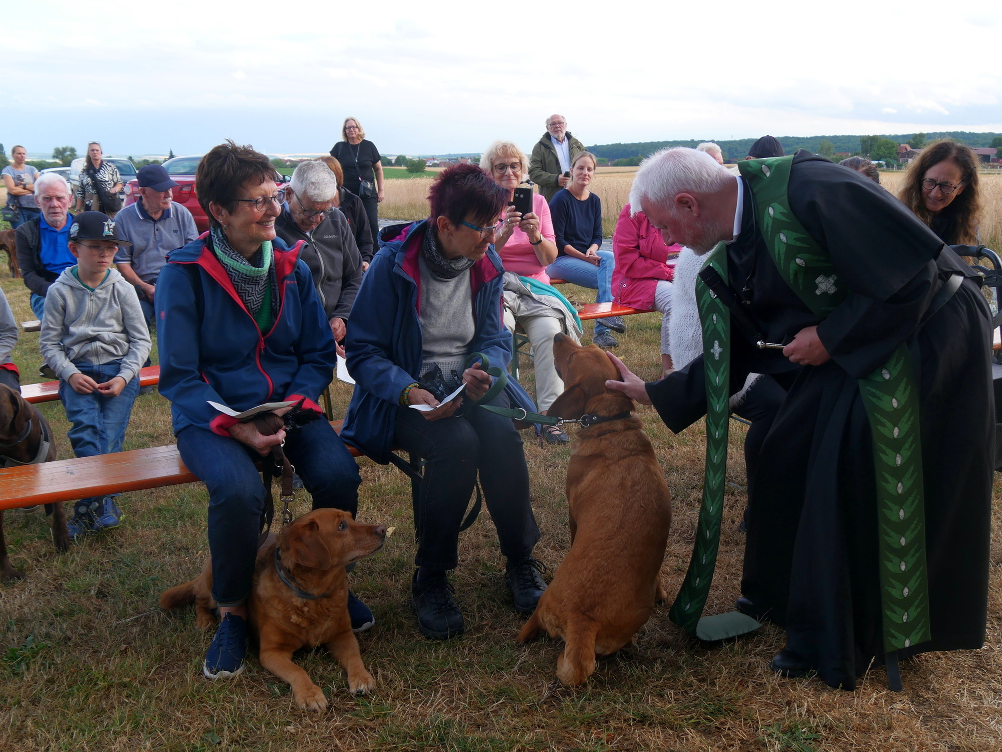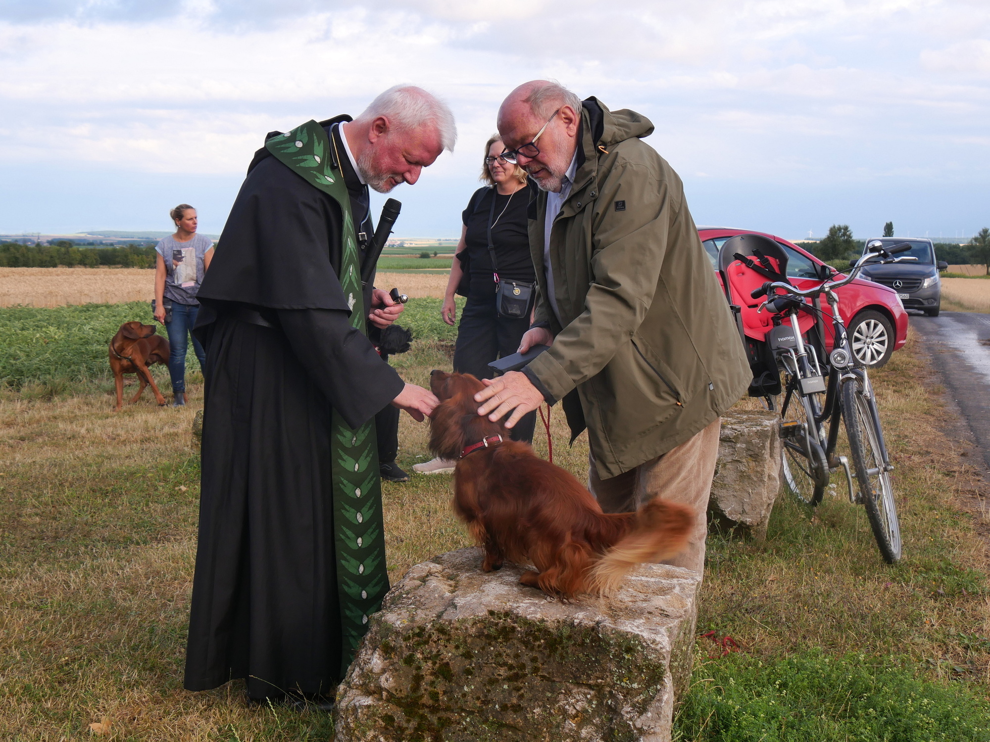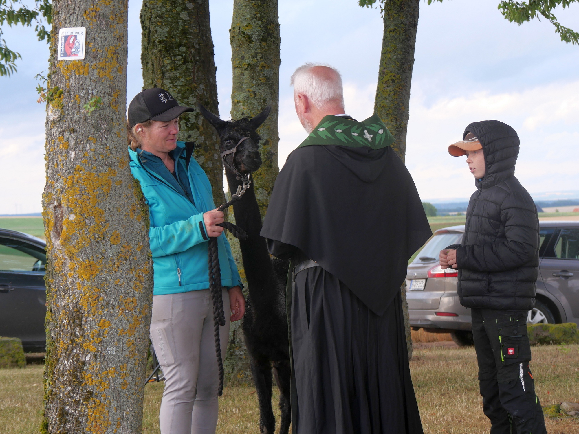 Zu einem besonderen Anlass versammelten sich Menschen und Tiere an der Hubertuskapelle bei Erbshausen-Sulzwiesen. Augustinerpater Matthäus Klein hatte zur Tiersegnung und damit zu einem Lobpreis Gottes mit all seinen Geschöpfen eingeladen. Die nahe Wallfahrtskirche Fährbrück lag im warmen Abendlicht, als der Gottesdienst beim Läuten der Glocke am Seilzug begann.