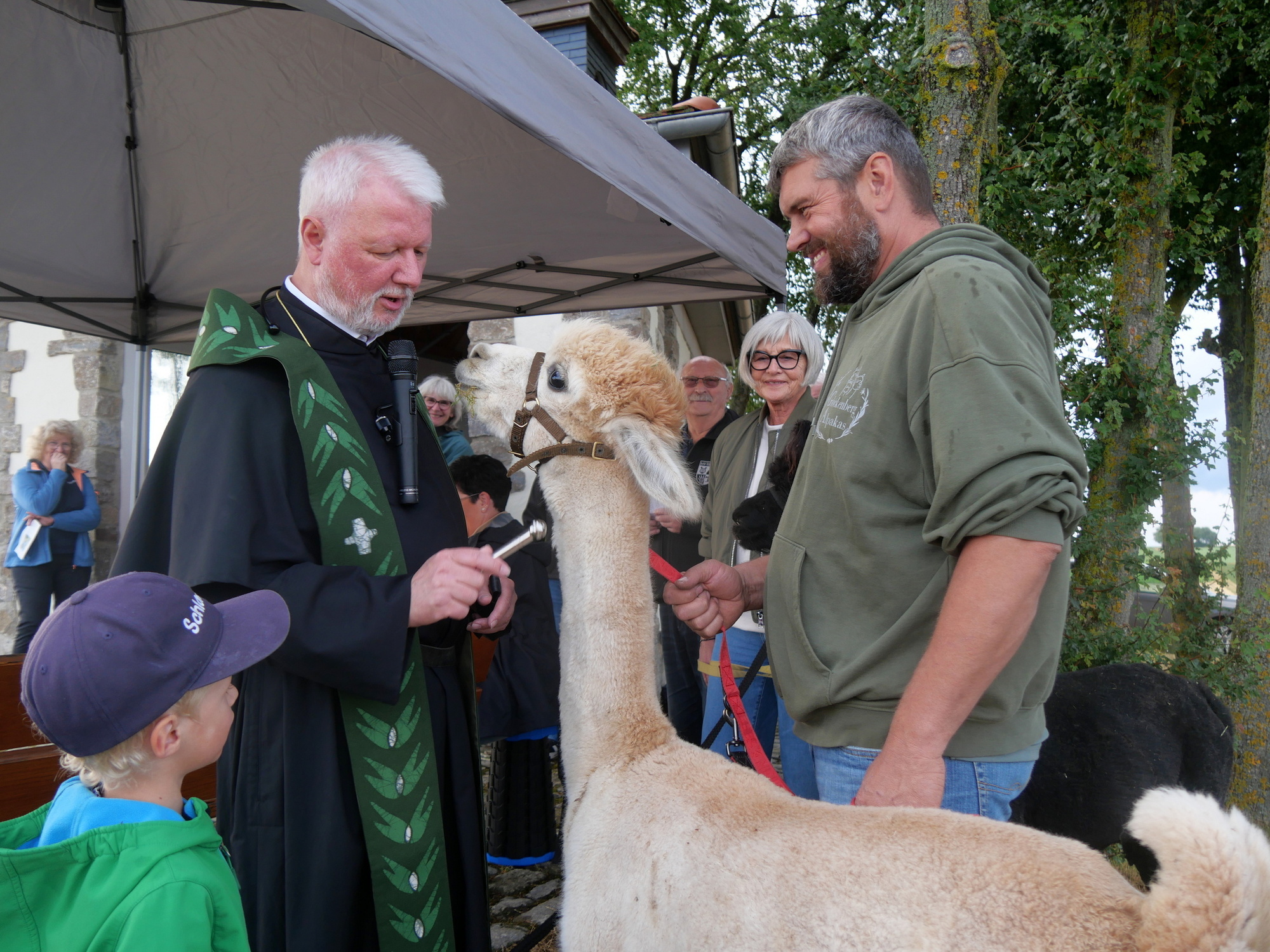 Der heimliche Star des Abends war ein acht Wochen altes Straußenbaby. Es wurde Groß und Klein bestaunt. Pater Matthäus streichelte alle Tiere liebevoll und besprengte sie mit Weihwasser. Er segnete auch die Alpakas Balou, Gismo, Asterix und Eldaron. Die Eigenschaften von Alpakas - etwa ihr ausgeprägtes Sozialverhalten - hatte Pater Matthäus als Beispiel für den Wert von Tieren für die Menschen genannt.