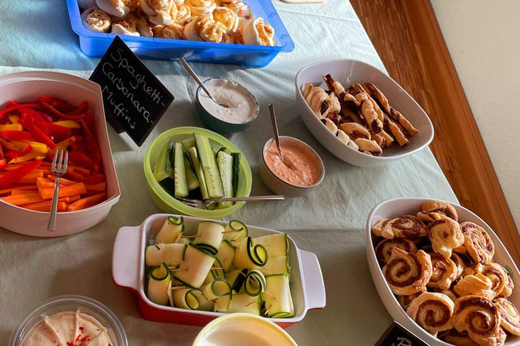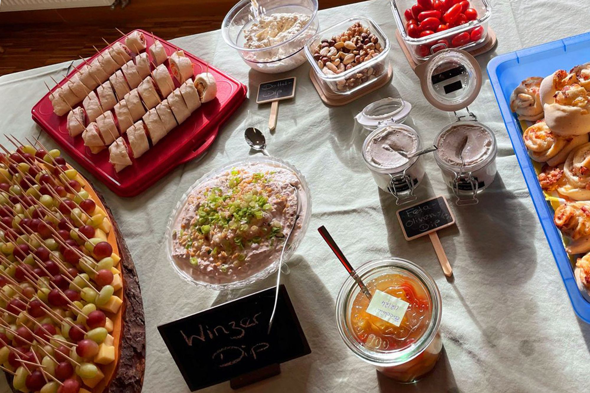 Nach der Heiligen Messe trafen sich die Familien und Senioren im herbstlich geschmückten Gemeindehaus zu einem Brunch, bei dem wieder allerlei Köstlichkeiten aufgetischt wurden. Jede Familie steuerte etwas zum großen Buffet bei, so dass eine reichhaltige Auswahl für alle Gaumenfreunde zur Verfügung stand. Dieses Fest findet bei allen so einen großen Zuspruch, dass mit circa 90 Personen das Gemeindehaus randvoll gefüllt war.