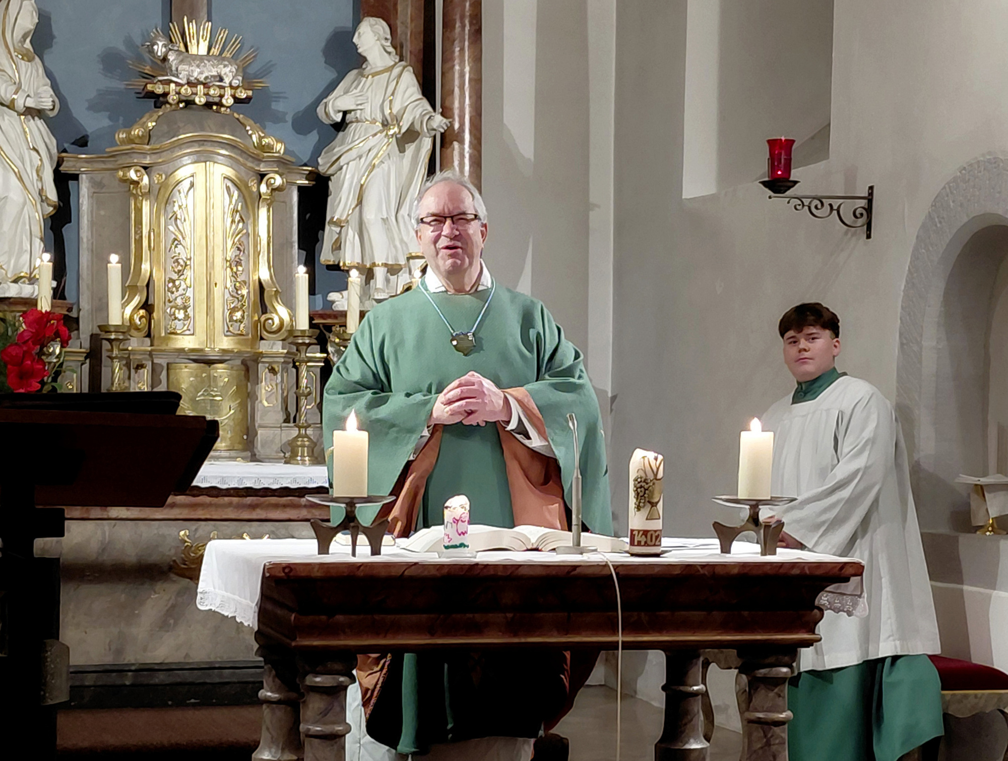 In der Pfarrkirche St. Wolfgang in Hausen vereinten sich am 14. Februar 2026 kirchliche Tradition und karnevalistisches Brauchtum auf nette Weise. Im Rahmen der Vorabendmesse zum Faschingswochenende durfte sich Pfarrer Helmut Rügamer über eine liebgewonnene Geste freuen: Er erhielt den aktuellen Sessionsorden des Karnevalclub Hausen (KCH).