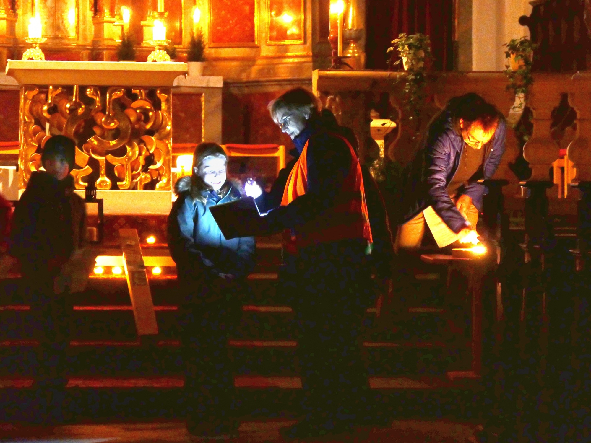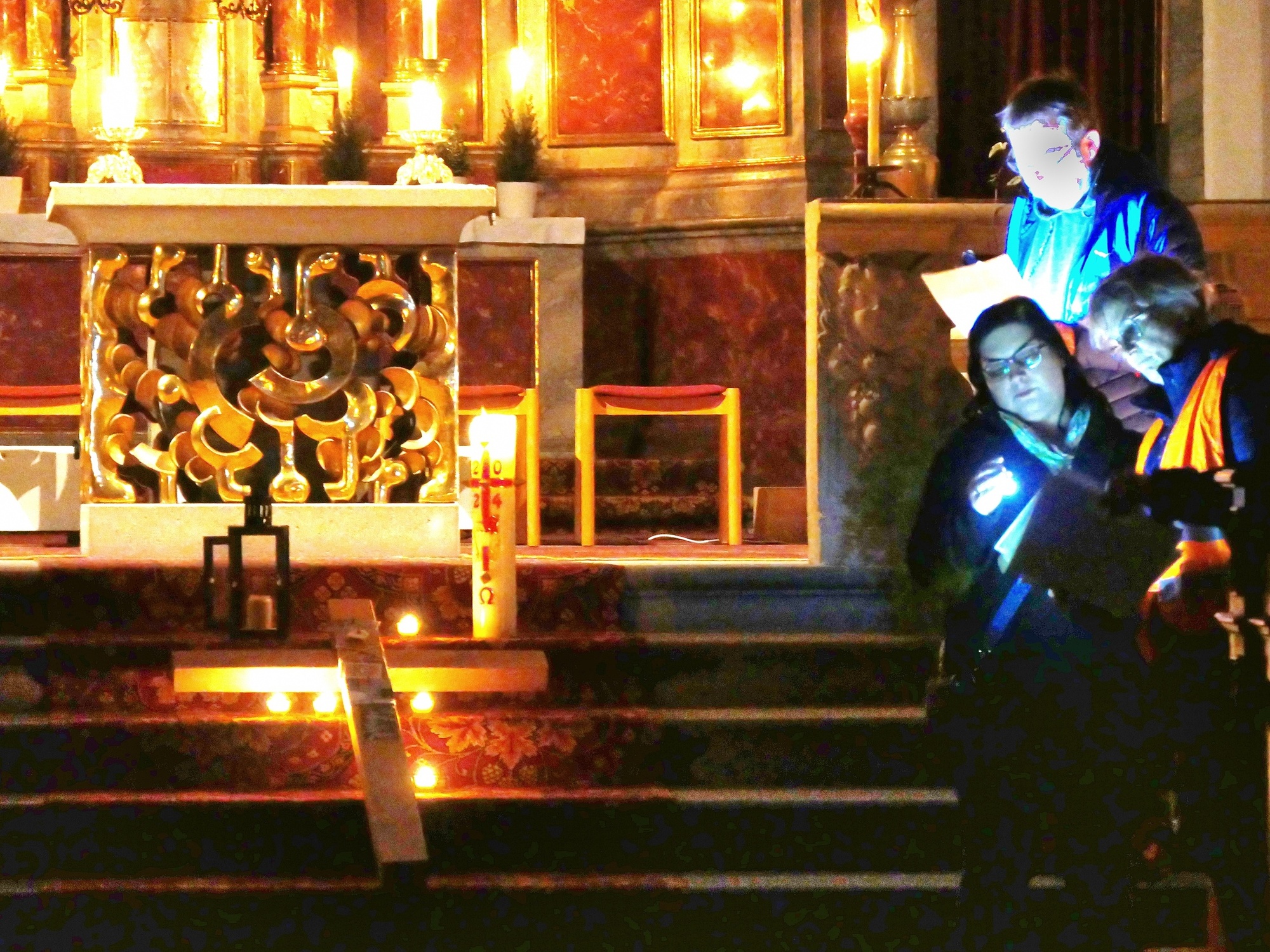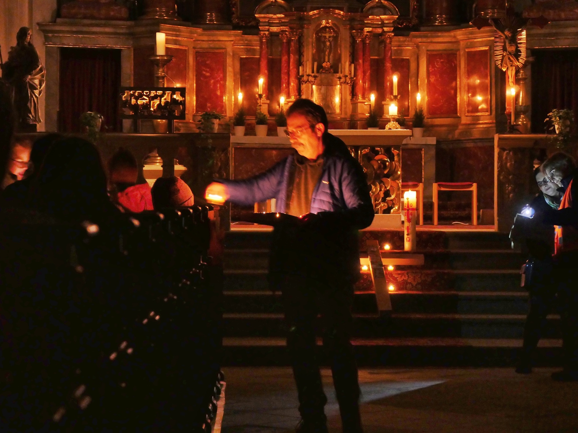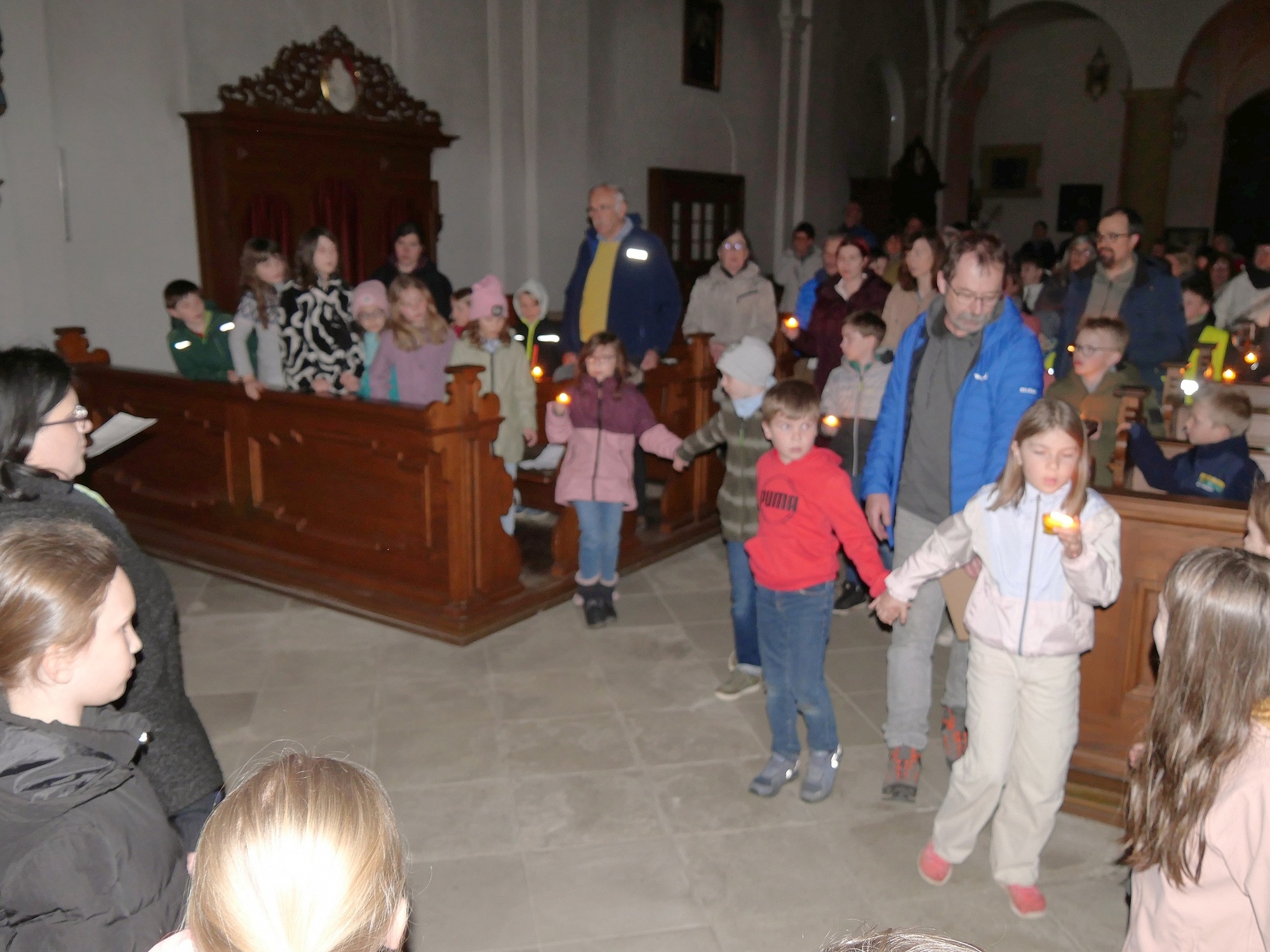 Die Wegstrecken begannen und endeten in den Dorfkirchen beziehungsweise beim Ziel in der Wallfahrtskirche Fährbrück. Beim Abschluss war die große Kirche nur mit Kerzenlicht beleuchtet. Kommunionkinder lasen Texte vor und brachten sich in diesen Kreuzwegteil besonders ein. Auf dem Weg von Hausen nach Fährbrück war auch eine Station beim Wegkreuz.