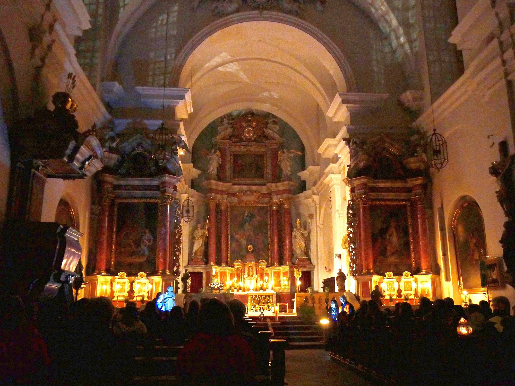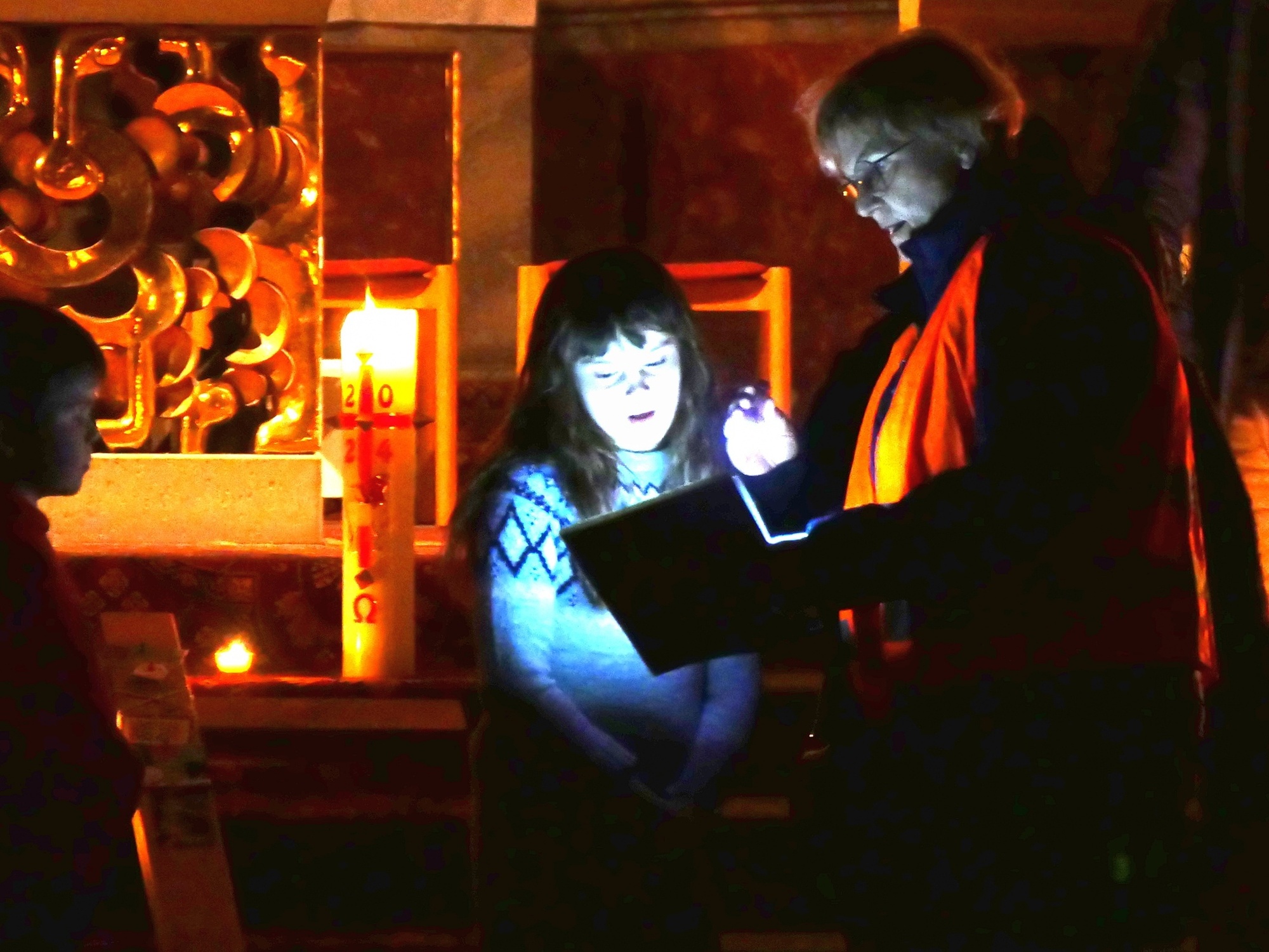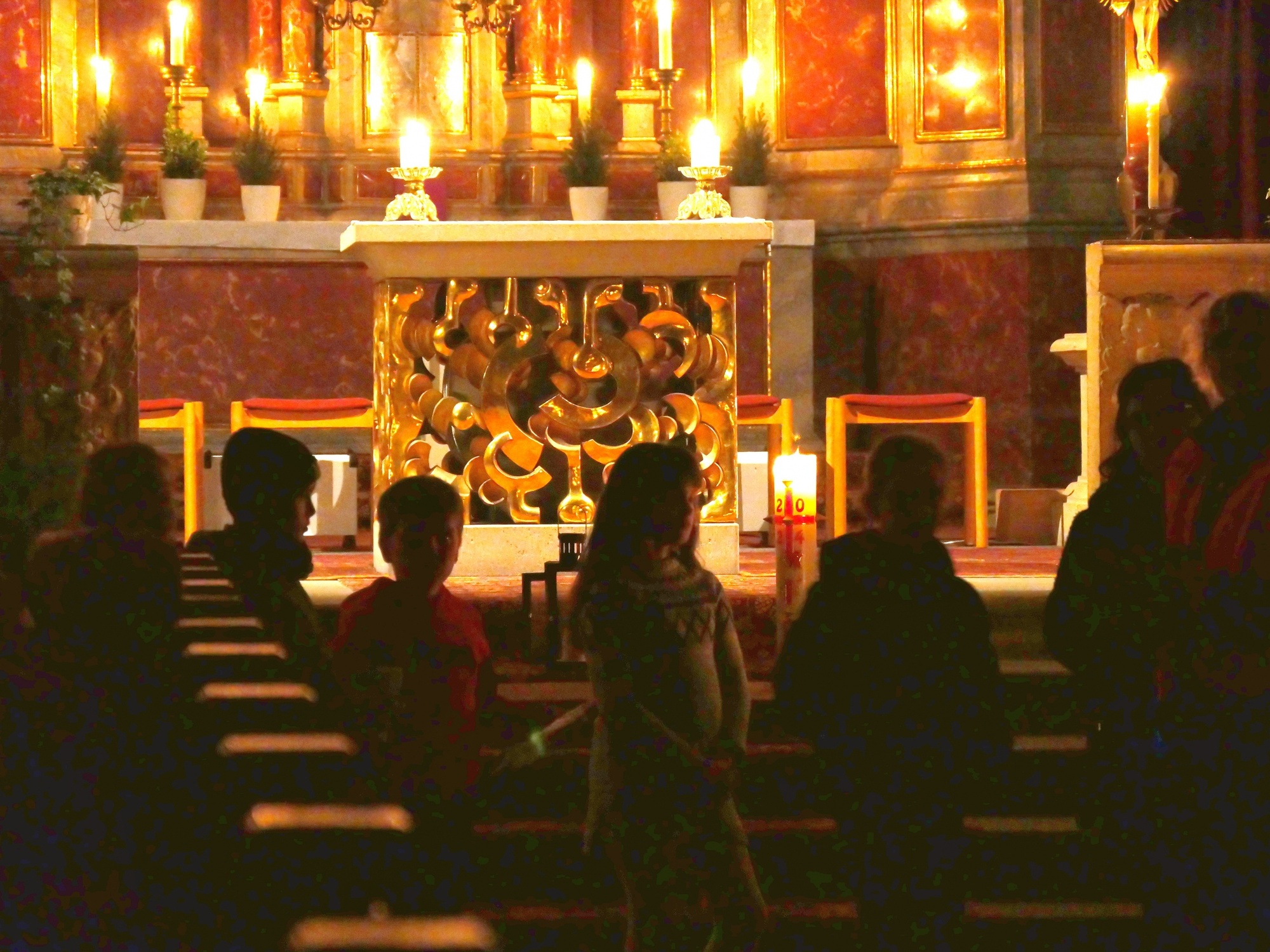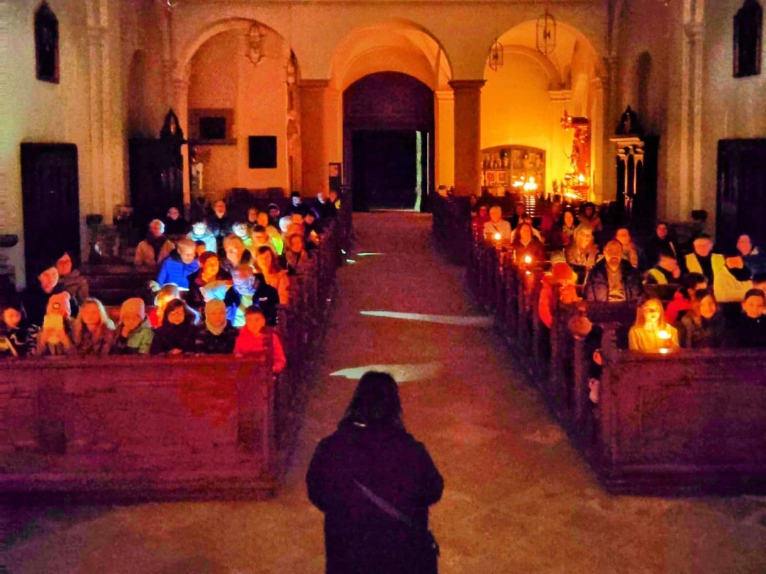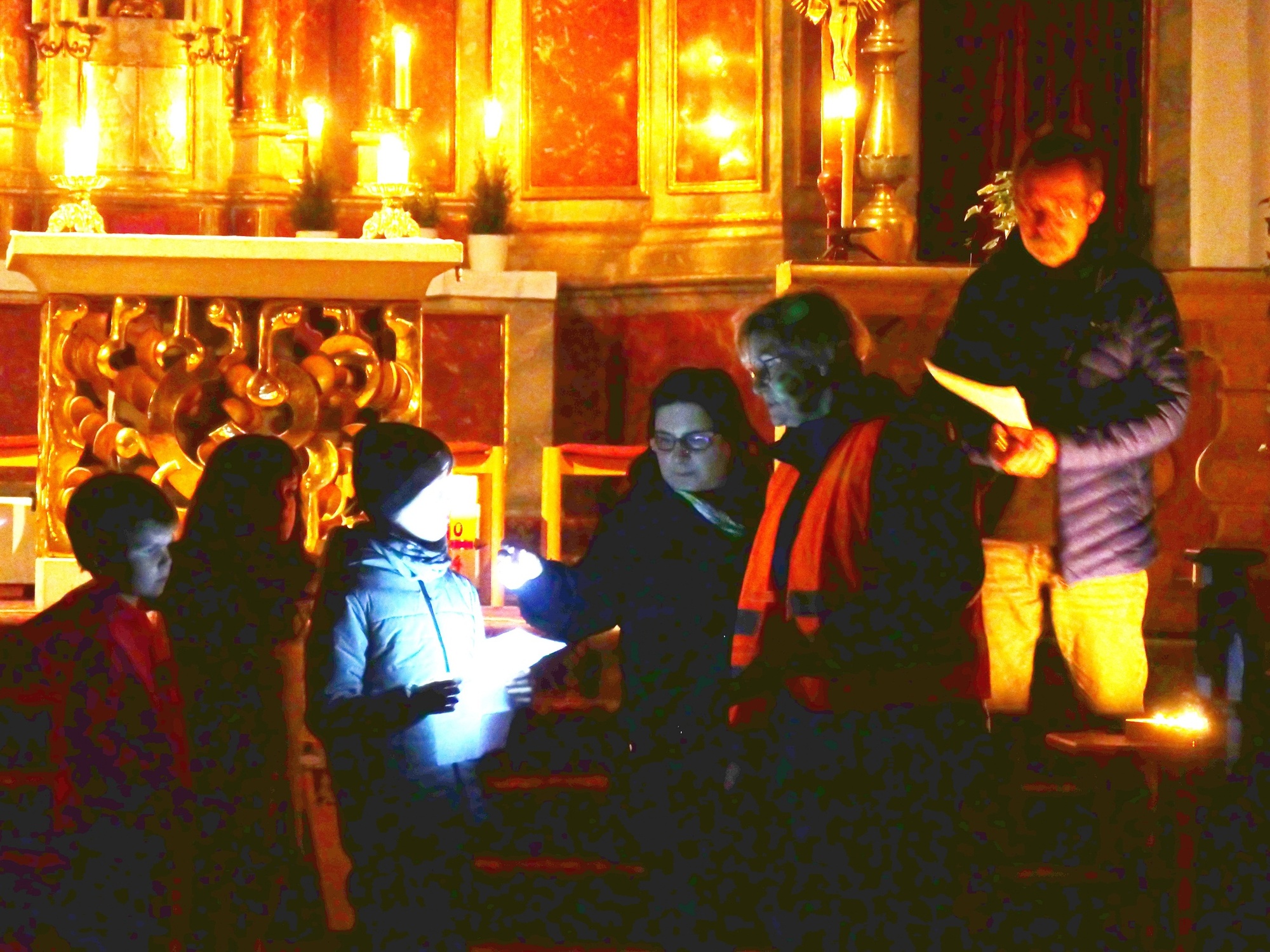 Die Wegstrecken begannen und endeten in den Dorfkirchen beziehungsweise beim Ziel in der Wallfahrtskirche Fährbrück. Beim Abschluss war die große Kirche nur mit Kerzenlicht beleuchtet. Kommunionkinder lasen Texte vor und brachten sich in diesen Kreuzwegteil besonders ein. Auf dem Weg von Hausen nach Fährbrück war auch eine Station beim Wegkreuz.