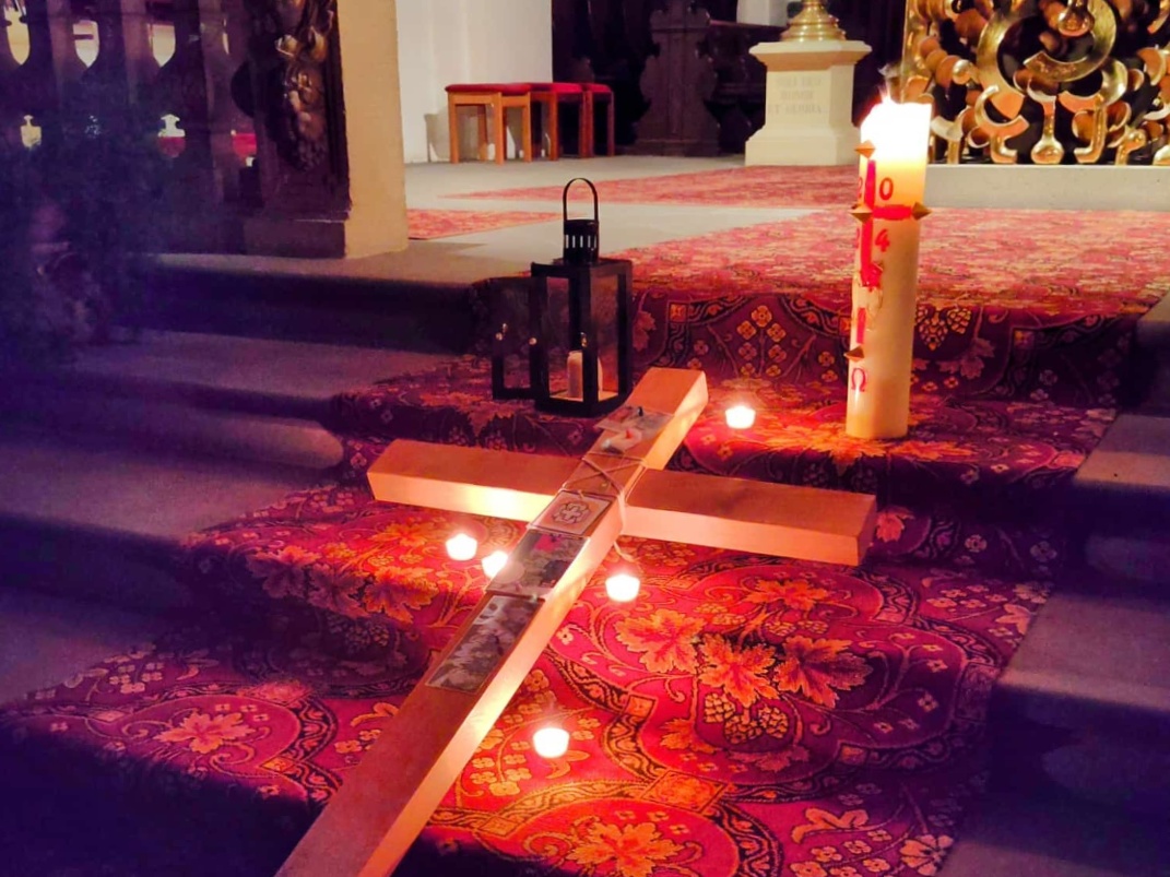Als das Kreuz schließlich auf den Altarstufen in der Wallfahrtskirche lag, wurden die letzten Symbole angeheftet. Somit erinnern nun ein Personalausweis, ein Teebeutel, das Symbol von SEDEC, ein Schulheft, ein Familienfoto und eine Kerze an die Gedanken, Gebete und Lieder des Kreuzweges.