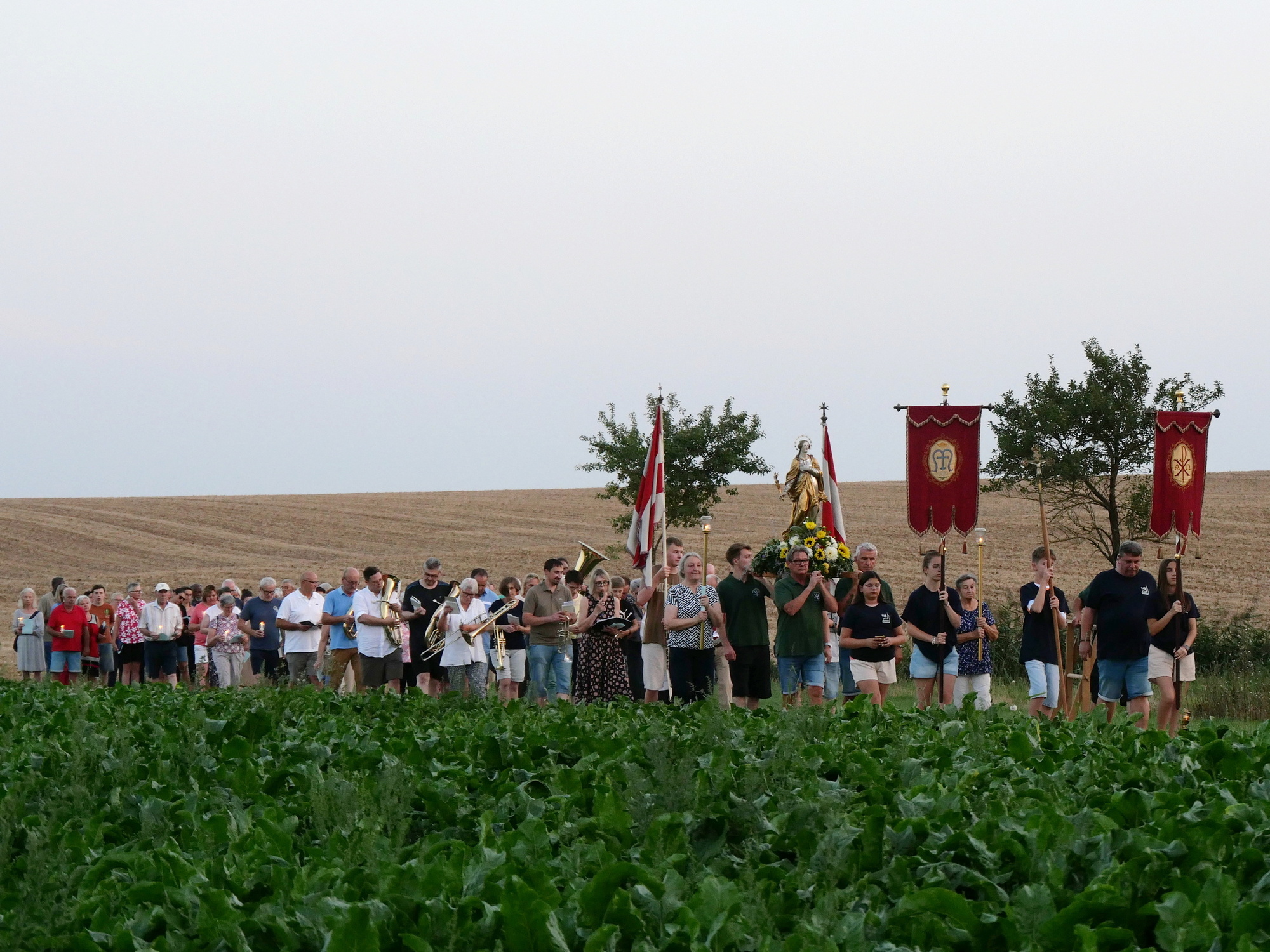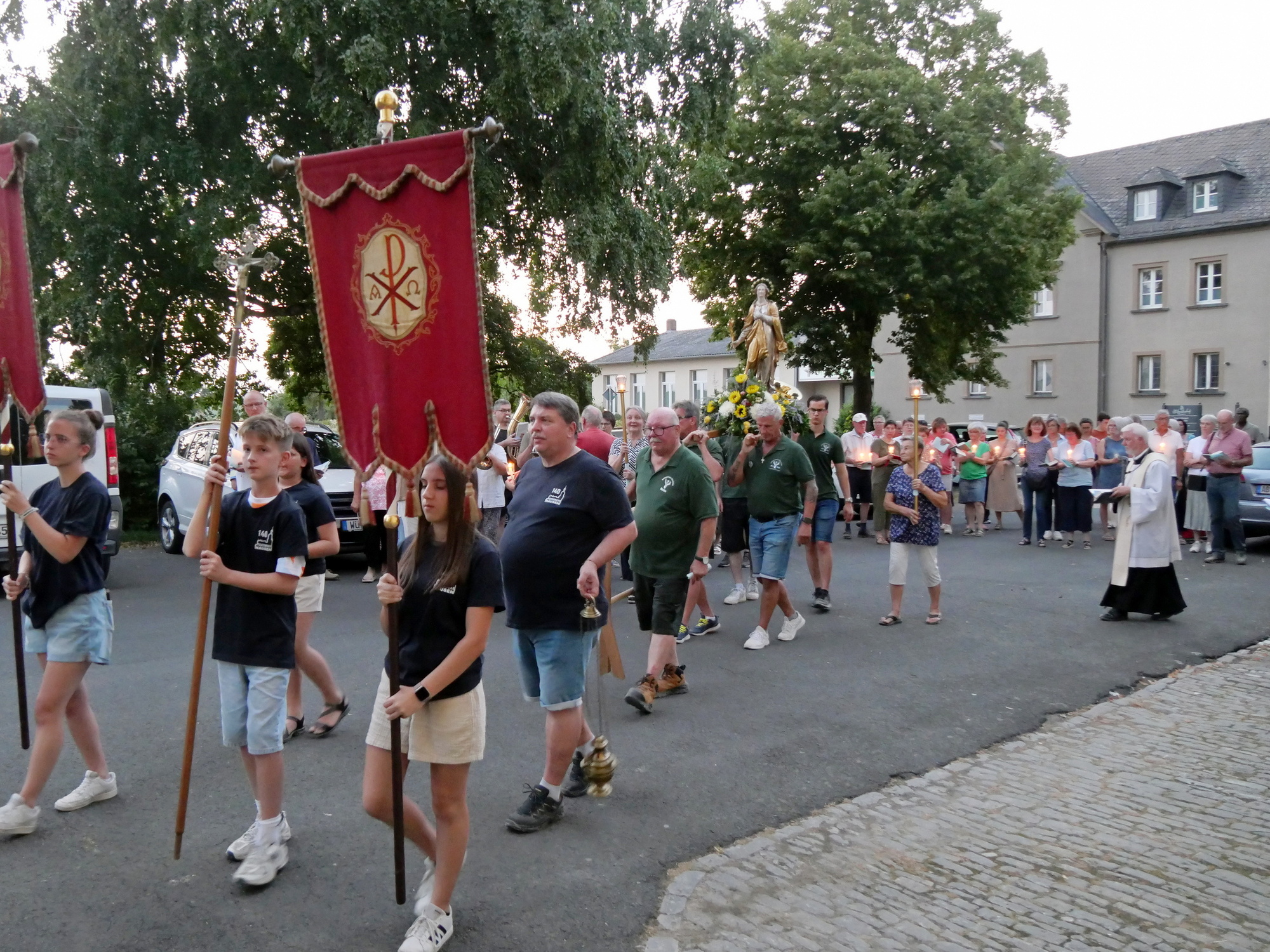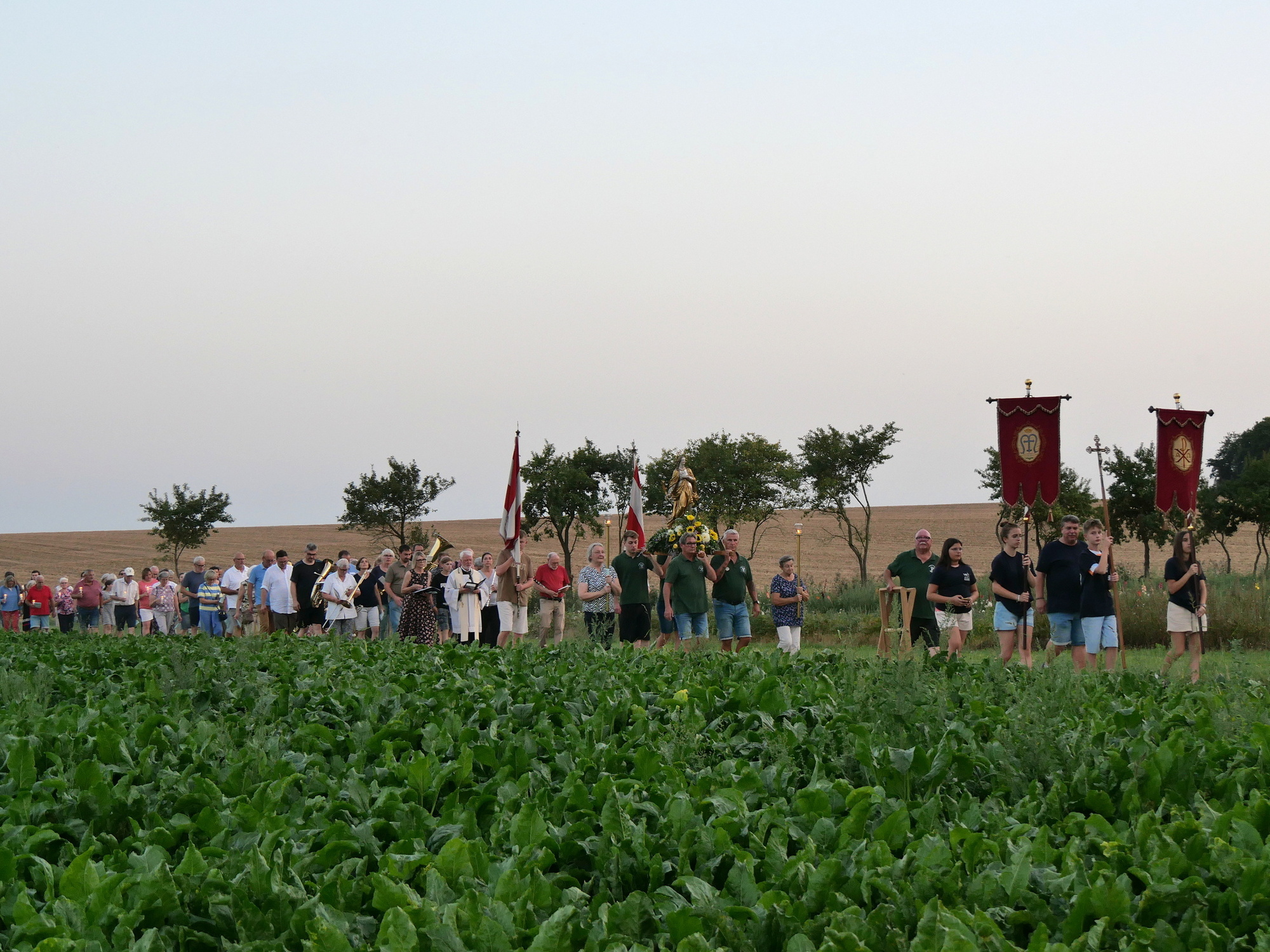 Mit Kerzen in den Händen, singend und betend, zogen die Teilnehmenden gemeinsam durch die Abenddämmerung. Im Licht der untergehenden Sonne grüßten sie die Gottesmutter als „Schwester im Glauben“ und „Trösterin der Betrübten“. Für die Prozession mit ihren vier Stationen war eigens aus Volkach eine Tragemadonna geliehen worden. Die mit Blumen geschmückte Figur der Muttergottes wurde von Mitgliedern des Katholischen Männervereins St. Hubertus mitgetragen.