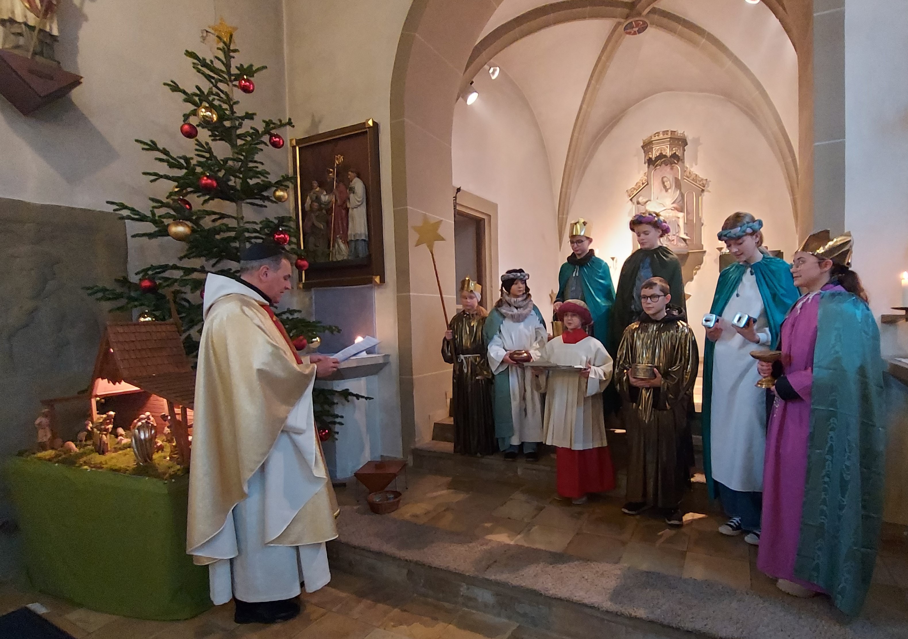 Im Dreikönigsfestamt begrüßte Regens Göttke die Sternsinger als Monarchen und Könige, wodurch sich die Kleinen sehr geehrt und geschätzt fühlten. Es war ihnen Ansporn den Segensgruß „Christus mansionem benedicat“ in jedes Haus zu tragen. Übersetzt bedeutet das: „Christus segne dieses Haus“. Neun Kinder zogen in zwei Gruppen durch Püssensheims Straßen und trugen den Menschen das diesjährige Motto „Kinder stärken, Kinder schützen“ mit Freude zu den Menschen. Denn Kinder sind darauf angewiesen, dass die Erwachsenen sie schützen, nicht nur in Indonesien, sondern auf der ganzen Welt, auch in Deutschland. Ein Sternsinger, Moritz Möller (15), konnte bei der Aussendungsfeier nicht dabei sein, weil er zeitgleich die Wortgottesdienstfeier in Oberpleichfeld als Organist gestaltete. Nach ihrem Dienst wurden die Sternsinger mit einem warmen Essen durch die Sternsingerverantwortliche Sonja Schwind und Ramona Baumeister belohnt. Domvikar Göttke spendete am Ende des Gottesdienstes nicht nur den Sternsingern den Segen, sondern auch den vielen anwesenden Kindern den Einzelsegen. Ausdrücklich bedankte er sich bei der Bläsergruppe unter Leitung von Christian Bach, die spontan für den erkrankten Organisten eingesprungen ist und den Gottesdienst festlich begleitete.