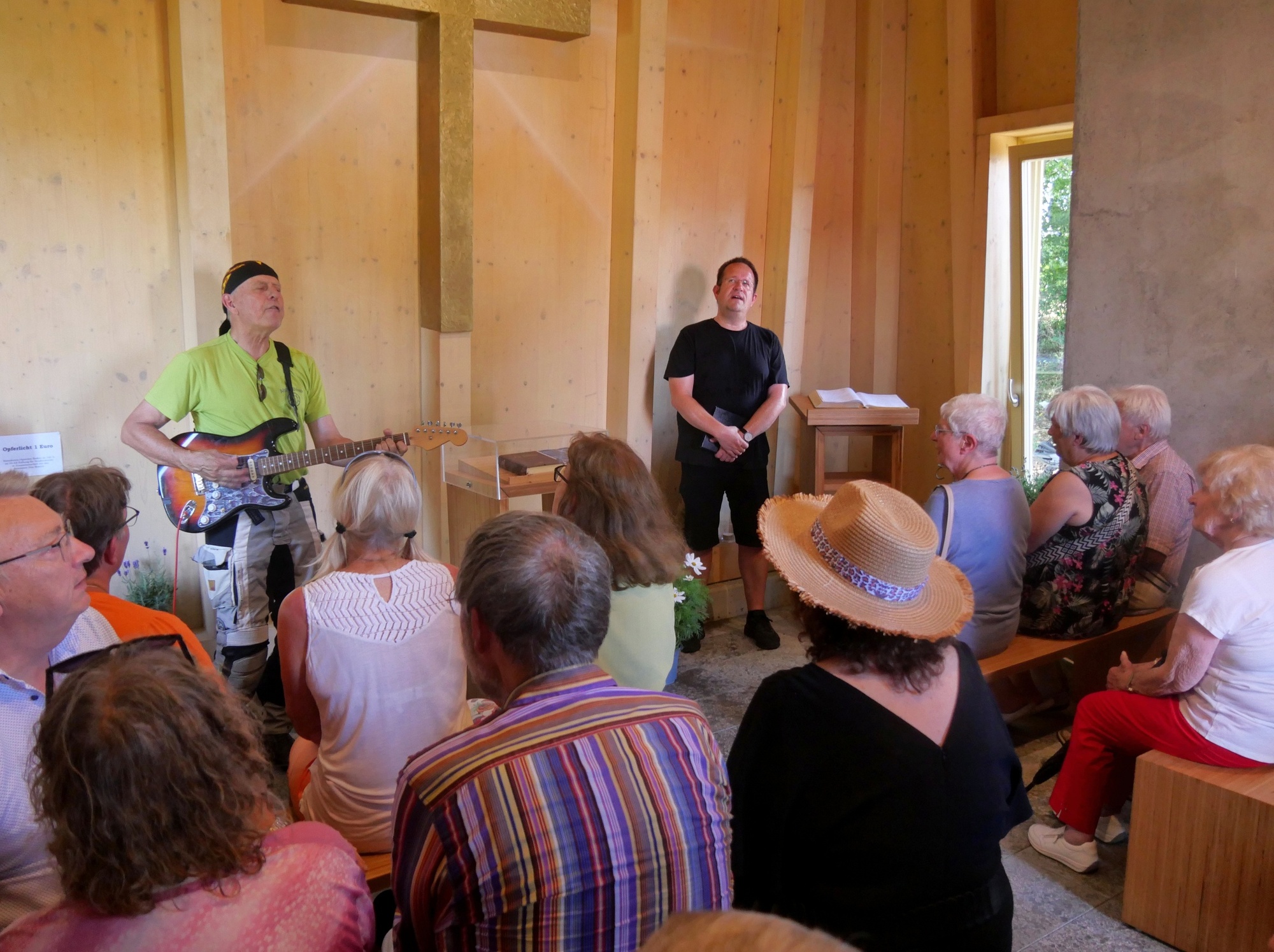 Es sei eine deutsche Besonderheit, dass es diese Autobahnkapellen überhaupt gibt, so Pfarrer Brückner. Bis auf wenige Ausnahmen gibt es diese Ruheorte an der Autobahn nur in unserem Land. Pfarrer Frank Witzel von der Arbeitsgemeinschaft Motorrad-Evangelisch der Evangelisch-Lutherischen Landeskirche begleitete mit der E-Gitarre den Gemeindegesang. Am Ende der Andacht lud er dazu ein, zu "Knockin' on heaven's door" mitzusingen.